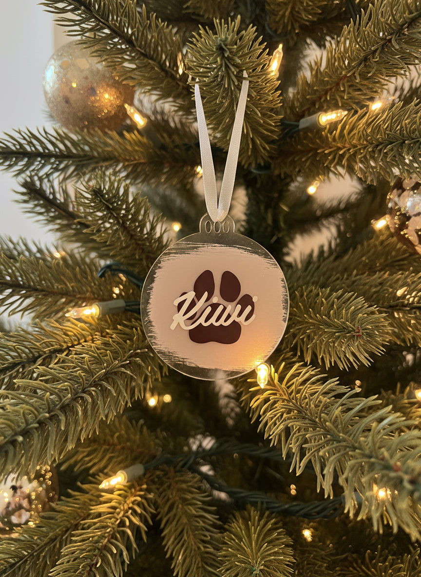 Personalisierter Weihnachtsbaumanhänger aus Acryl mit einer niedlichen Hundepfote und dem Namen des Hundes. Das perfekte Geschenk für jeden Hundebesitzer!